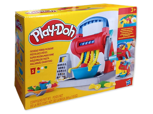 Zestaw ciastoliny Play-Doh Makaronowe Party marki Hasbro zawierający 5 pojemniczków z ciastoliną o łącznej masie 284, maszynę do makaronu z korbką, 2 wałki do formowania makaronu, tarka, talerzyk, miseczka, 2 widelec oraz 2 foremki do formowania makaronów. Ciastolina zapewni dziecku wspaniałą zabawę, rozwijając przy tym kreatywność i zdolności manualne dziecka. Zestaw jest przeznaczony dla dzieci powyżej 3 roku życia.