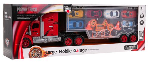 | Duża ciężarówka z naczepą, autkami i akcesoriami dla dzieci od 3-go roku życia. Zabawka wykonana została ze świetnej jakości materiałów, w żywych kolorach. Duża ciężarówka posiada naczepę, w której znajduje się 6 autek, znaki drogowe i słupki. Naczepę możemy odłączać od pojazdu, wówczas uzyskamy walizkę na pojazdy z wygodną rączką do przenoszenia. Tylne drzwi naczepy są otwierane i tworzą platformę do wyjeżdżania pojazdów ze środka. Funkcje zestawu: - odpowiedni dla dzieci powyżej 3-go roku życia, - wykonany z wytrzymałych materiałów, - żywe kolory przyciągają uwagę dziecka, - odczepiana naczepa pojazdu, - otwierany tył i boki naczepy, - wygodna rączka do przenoszenia, - bogate wyposażenie. |