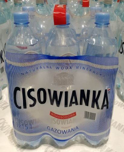 Naturalna woda mineralna Cisowianka, tradycyjnie gazowana, o średnim poziomie mineralizacji.