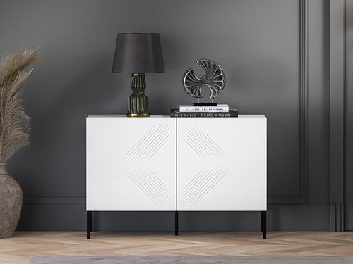 CLEARING niska komoda z 2 drzwiami otwieranymi na boki. Wewnątrz szeroka przestrzeń podzielona pionową przegrodą i 2 półkami z płyty. Komoda na nóżkach w kolorze złotym lub czarnym do wyboru z wzornika.