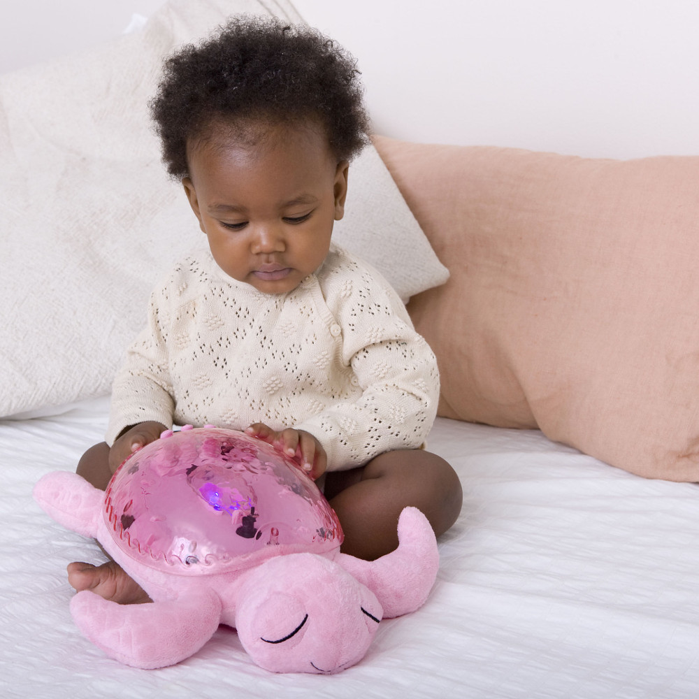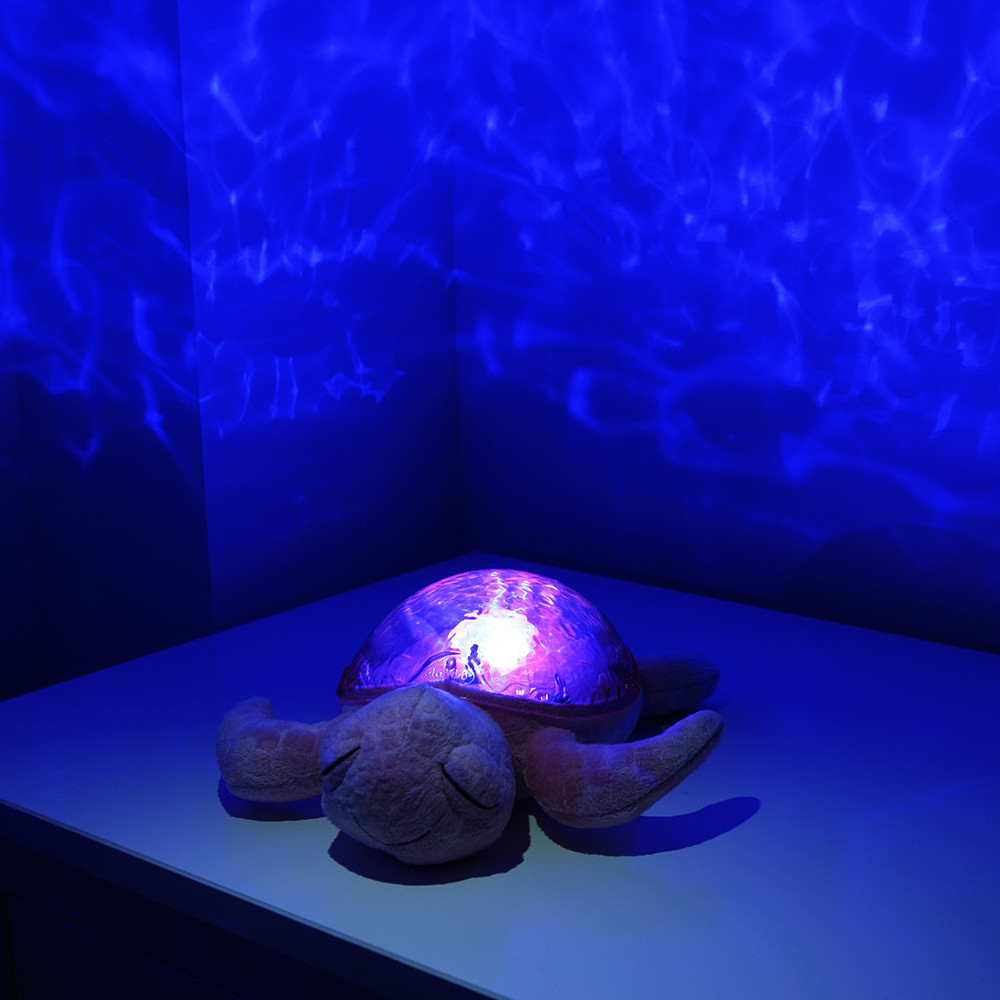Pomimo swojego sennego wyglądu żółw w rzeczywistości pracuje podwójnie, aby pomóc dziecku zasnąć. Odtwarza jeden z czterech uspokajających dźwięków (sprawdzony sposób na pobudzenie snu). I jak wielu, z Was rodziców pewnie wie, wyobraźnia może szaleć w nocy i czasami przerażać maluchów. Tranquil Turtle tworzy podwodny świat, oświetlając drogę do bardziej komfortowego i spokojnego snu. Miękki, pluszowy, z wytrzymałą plastikową skorupą. Żółwia najlepiej umieścić na podłodze, pośrodku pokoju i zgasić światło, aby uzyskać pełny, uspokajający efekt oceanu na suficie i ścianach. Wystarczy nacisnąć przycisk na skorupie żółwia, aby uruchomić projektor świetlny i cieszyć się jego blaskiem przez pełne 23 minuty - tyle wystarczy, aby większość dzieci mogła spokojnie zasnąć i przenieść się w krainę snów. Po tym czasie, projektor automatycznie się wyłącza, tym samym przedłużając żywotność baterii i pozwalając dziecku zapaść w najgłębszy sen, zgodnie z zaleceniami pediatrów. W razie potrzeby ponowne naciśnięcie przycisku aktywuje projekcję. Tranquil Turtle to świetny pomysł na prezent dla maluchów, które boją się ciemności, a także dla dorosłych, którzy mają problemy z zasypianiem. Być może najlepszą rzeczą w tej niezwykłej lampce jest to, że staje się pluszowym przyjacielem, towarzyszącym dziecku na dobranoc przez wiele lat!