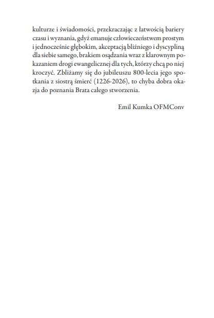 Czeka Cię trudna rozmowa z bliskim? Masz problem z ocenianiem innych? A może powiedziałeś coś głupiego i nie wiesz teraz, jak wyjść z tego z twarzą? Dowiedz się, co na Twoim miejscu zrobiłby św. Franciszek! O. Emil Kumka opisuje sceny z życia Asyżanina, które mogą zaskakiwać. W 52 krótkich rozważaniach na każdy tydzień roku pokazuje go jako człowieka z krwi i kości. Okazuje się, że Franciszek czynił wielkie cuda, ale jednocześnie mierzył się ze zwykłymi słabościami, rozterkami czy nawet błędami. W tym roku przeżyj każdy tydzień ze św. Franciszkiem! O. Emil Kumka – brat mniejszy konwentualny, wykładowca historii Kościoła epoki starożytnej i średniowiecznej oraz hagiografi i franciszkańskiej na Papieskim Wydziale Teologicznym św. Bonawentury w Rzymie. W swoim dorobku naukowym i popularyzatorskim koncentruje się na źródłach biografi cznych o św. Franciszku oraz historii Rodziny Franciszkańskiej.