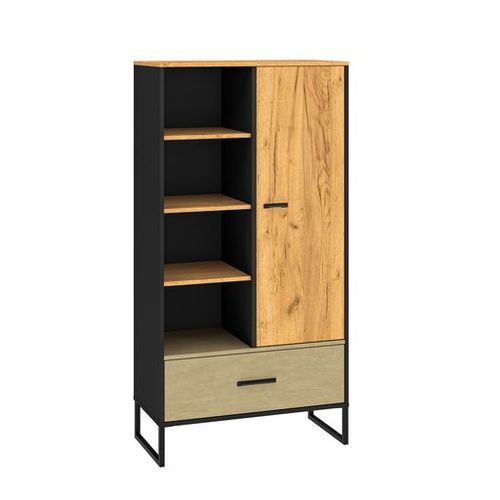 Regał z półkami, jedną szufladą i jednymi drzwiami.