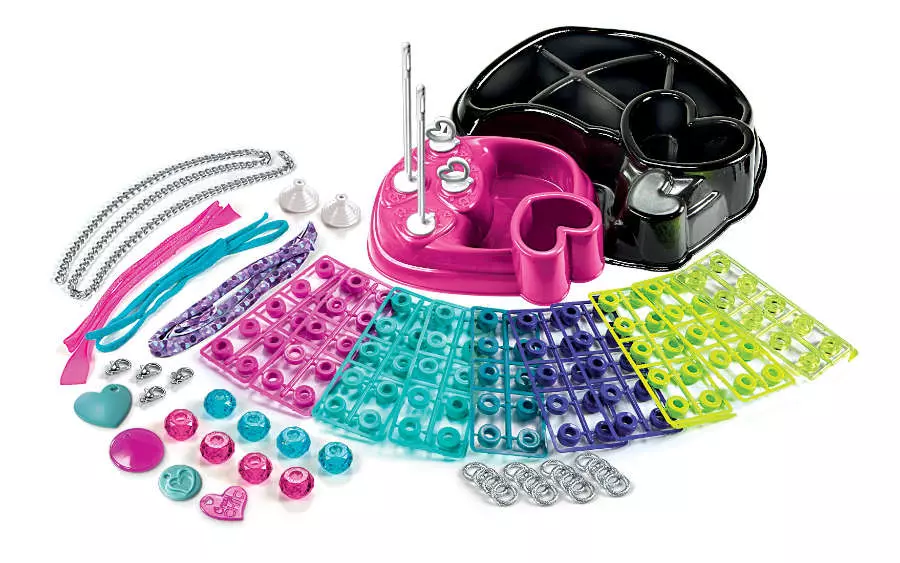 Ekskluzywny zestaw do tworzenia bransoletek zgodnie z najnowszymi trendami! Stwórz swoją wymarzoną bransoletkę w takim stylu, w jakim tylko pragniesz. Zestaw zawiera: • 100 kolorowych pierścieni z tworzywa sztucznego (niektóre z metalicznym wykończeniem), • błyszczące taśmy i łańcuszki, • maszynkę ułatwiającą składanie. Wymiary opakowania: 29.0 x 22.5 x 6.0 cm