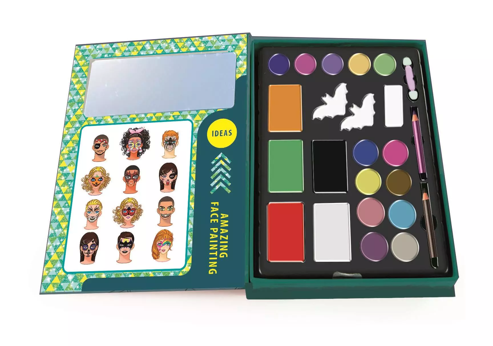 Fantastyczny zestaw do makijażu dla dzieci, zawierający wszystko, czego potrzeba, aby stworzyć „przerażająco” piękną maskę na Halloweenową noc! Kosmetyczka zawiera: • farby do twarzy, • cienie do powiek, • kredki do ciała, • pędzelek i gąbki w kształcie nietoperza. Naprawdę wyjątkowy zestaw do zabawy podczas malowania twarzy i kreatywnej wędrówki po świecie makijażu. Rozwija zręczność manualną i fantazję. Poręczna kosmetyczka w kształcie książki, którą można nosić wszędzie! Jedno z najbardziej zabawnych i atrakcyjnych zajęć zarówno dla chłopców, jak i dziewcząt, którym można cieszyć się podczas urodzin, imprez karnawałowych i Halloweenowych lub po prostu w domu z przyjaciółmi. Wymiary opakowania: 4.0 x 19.0 x 25.0 cm