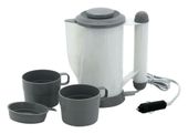 Czajnik z wtyczką do gniazda zapalniczki samochodowej. Objętość czajnika zapewni wystarczającą ilość ciepłej wody dla załogi samochodu. Opakowanie zawiera czajnik z przewodem zasilającym o długości 135 cm, 2 filiżanki, sitko do herbaty, uchwyt do mocowania czajnika oraz ogranicznik.