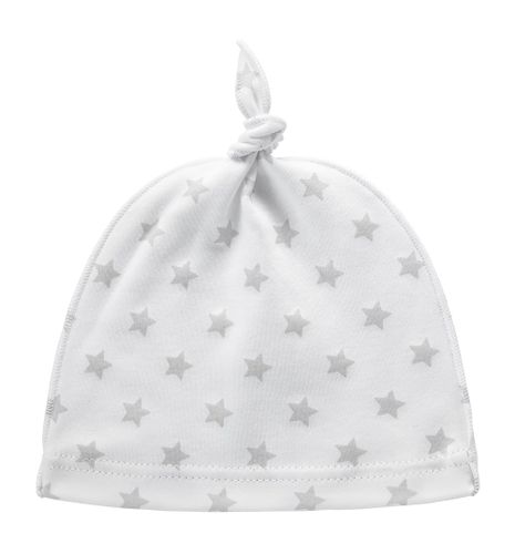 Niemowlęca czapka uszyta z najwyższej jakości bawełny odznaczonej certyfikatem Oeko-Tex Standard 100 Tekstylia godne zaufania. Materiał jest bardzo miękki i przyjemny w dotyku. Biała czapeczka ozdobiona została szarymi gwiazdkami i dekoracyjnym wiązaniem na górze. Czapkę można połączyć z innymi produktami z tej serii, by stworzyć piękną wyprawkę dla niemowlaka.