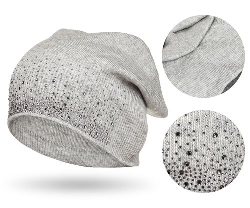 Czapka PETERSON® to doskonała czapka dla kobiet, które cenią sobie zarówno wygodę, jak i stylowy wygląd, niezależnie od okazji. Wykonana z miękkiego, szarego materiału o prążkowanym brzegu, ozdobiona została efektownym gradientowym zdobieniem z błyszczących kryształków różnej wielkości, które nadają jej wyjątkowego charakteru.