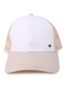 Damska czapka bejsbolówka w kolorze beżowo-białym. O klasycznym kroju, z lekko wygiętym daszkiem. Z przodu znajduje się subtelna przywieszka w kształcie serca.