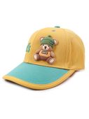 Dziecięca czapka bejsbolówka w dominującym kolorze żółtym. O klasycznym kroju, z lekko wygiętym daszkiem. Z przodu motyw misia.