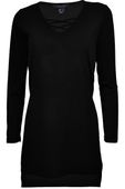 Tunika firmy Atmosphere, w odcieniu czarnym. Na długi rękaw. Tunika asymetryczna - o dłuższym tyle. Na dekolcie przeplatana. Bo bokach tunika posiada rozcięcia. Materiał miły w dotyku i elastyczny, dobrze dopasowuje się do sylwetki. Z kompletem firmowych metek.