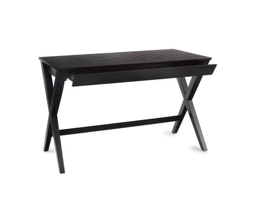 Pomalowane na czarno biurko pokryte jest dębowym fornirem. Blat ma ścięte pod kątem krawędzie. Pod blatem znajduje się pojedyncza szuflada, której front również ułożony jest ukośnie.