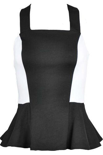 Bluzka firmy Atmosphere, w kolorze czarnym, boki w kolorze białym. Bluzka na grubych ramiączkach - skrzyżowane z tyłu. Odcinana w pasie, na dole rozszerzana - baskinka. Materiał elastyczny, dobrze dopasowuje się do sylwetki. Z kompletem firmowych metek.