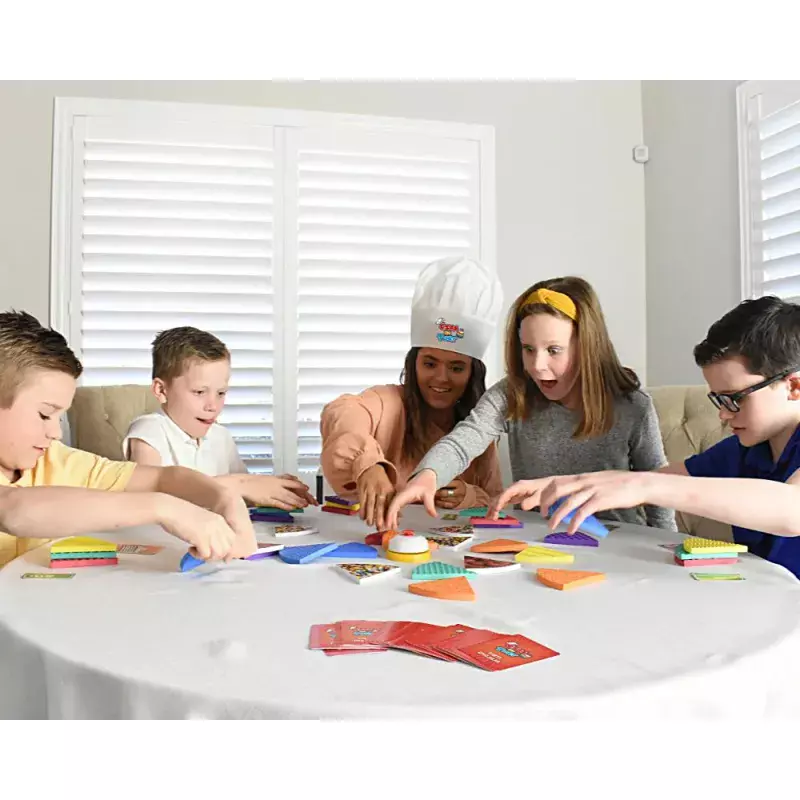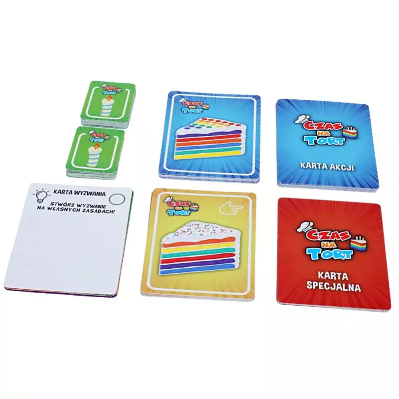 „Czas na tort” to zabawna, kolorowa gra dla najmłodszych, stymulująca zmysły. Produkt łączy w sobie elementy zabawy sensorycznej i logicznej. Rozgrywka jest bardzo prosta – należy jak najszybciej ułożyć warstwy tortu w określonej kolejności. Wygrywa najszybszy! Gra posiada 3 tryby rozgrywki – od najłatwiejszego do nieco bardziej skomplikowanego. To nie tylko świetna zabawa dla najmłodszych. Gra uczy zręczności, rozpoznawania kolorów i tekstur. Nie wymaga znajomości czytania, jest łatwa do posprzątania. To się nazywa gra warta świeczki! Zawartość opakowania: • talia kart do gry (18 kart akcji, 18 kart specjalnych, 2 karty wyzwania), • 32 karty świecy, • dzwonek, • czapka szefa kuchni, • 6 dwustronnych kawałków lukru, • tort urodzinowy (składający się z 36 różnokolorowych kawałków teksturowanej pianki).
