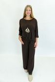 Ten czekoladowy komplet jest doskonałym wyborem na jesień i zimę, dzięki swojemu ciepłemu odcieniowi, który świetnie współgra z bardziej stonowanymi, neutralnymi dodatkami. Stylizuj go z botkami na niskim obcasie i elegancką torebką, aby stworzyć harmonijny, modny look na spotkania z przyjaciółmi lub wyjścia do pracy. Możesz też podkreślić jego casualowy charakter, łącząc go z lekkimi sandałami i delikatną biżuterią. Szerokie nogawki spodni dodają elegancji, a ich luźny krój sprawia, że wyglądają stylowo i komfortowo na każdej sylwetce.
