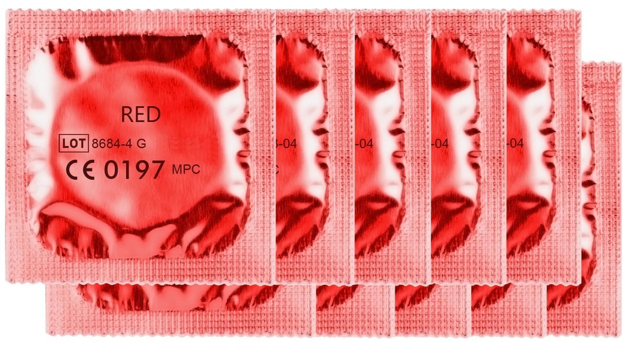 W czerwonym kolorze, gładkie, z dodatkowym zbiorniczkiem, pokryte substancją nawilżającą.