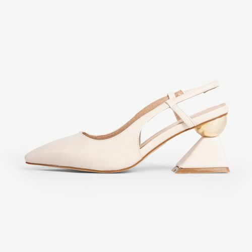 Wkrocz w świat wyrafinowania z nowoczesnym akcentem. Obcas RAID Jasmine to wyjątkowy model, który łączy klasyczną elegancję z architektonicznym zacięciem. Wykonany w gładkim, kremowym kolorze, but charakteryzuje się ostrym, spiczastym noskiem i unikatowym, rzeźbiarskim, klockowym obcasem – łączącym błyszczącą złotą kulę z podstawą w kształcie piramidy, co tworzy odważny, inspirowany sztuką look.