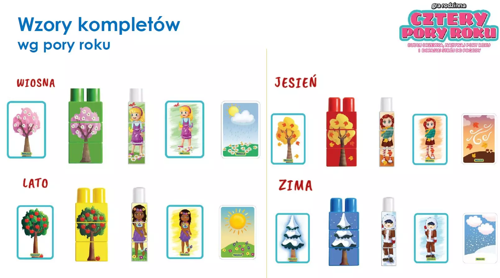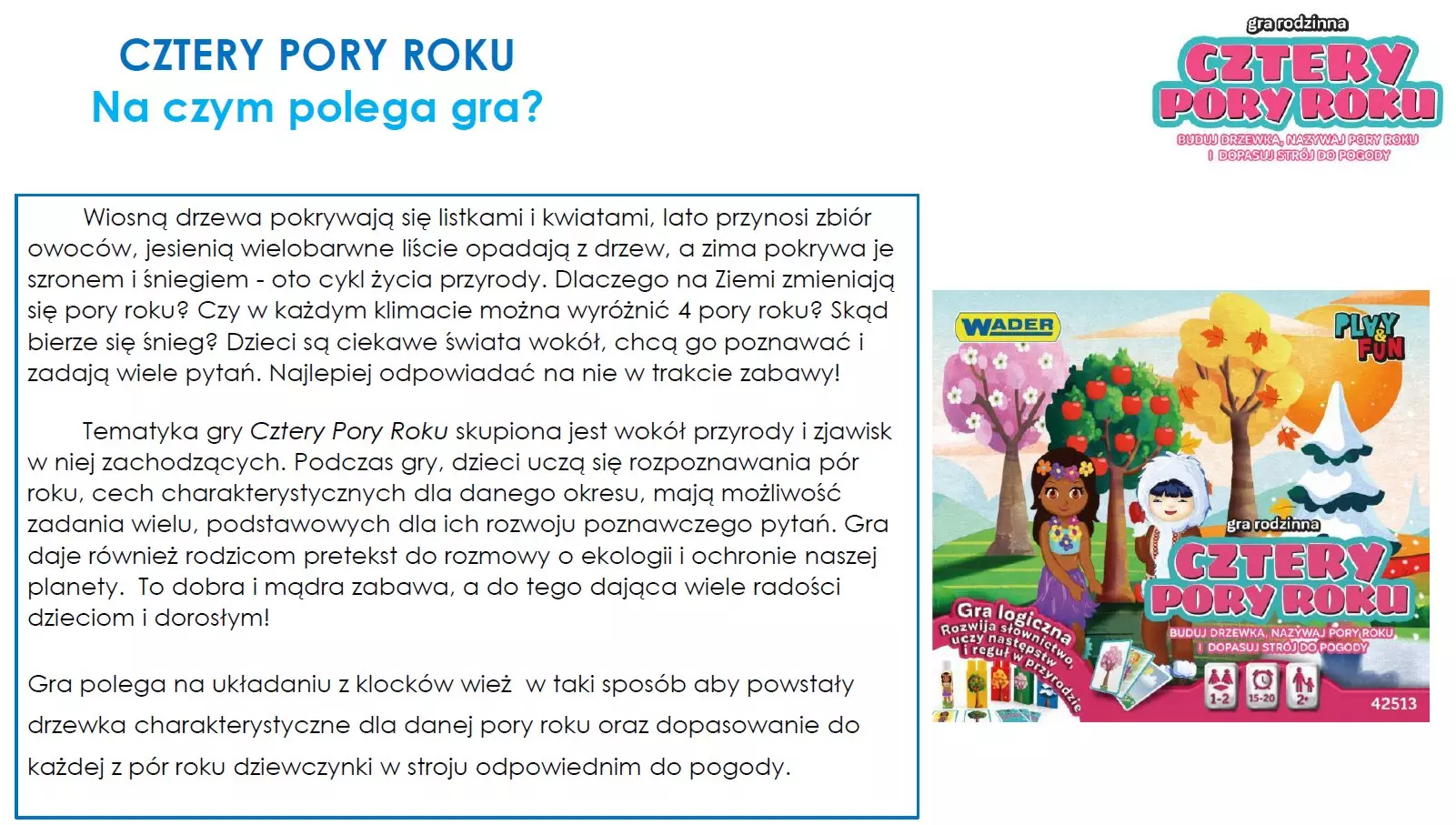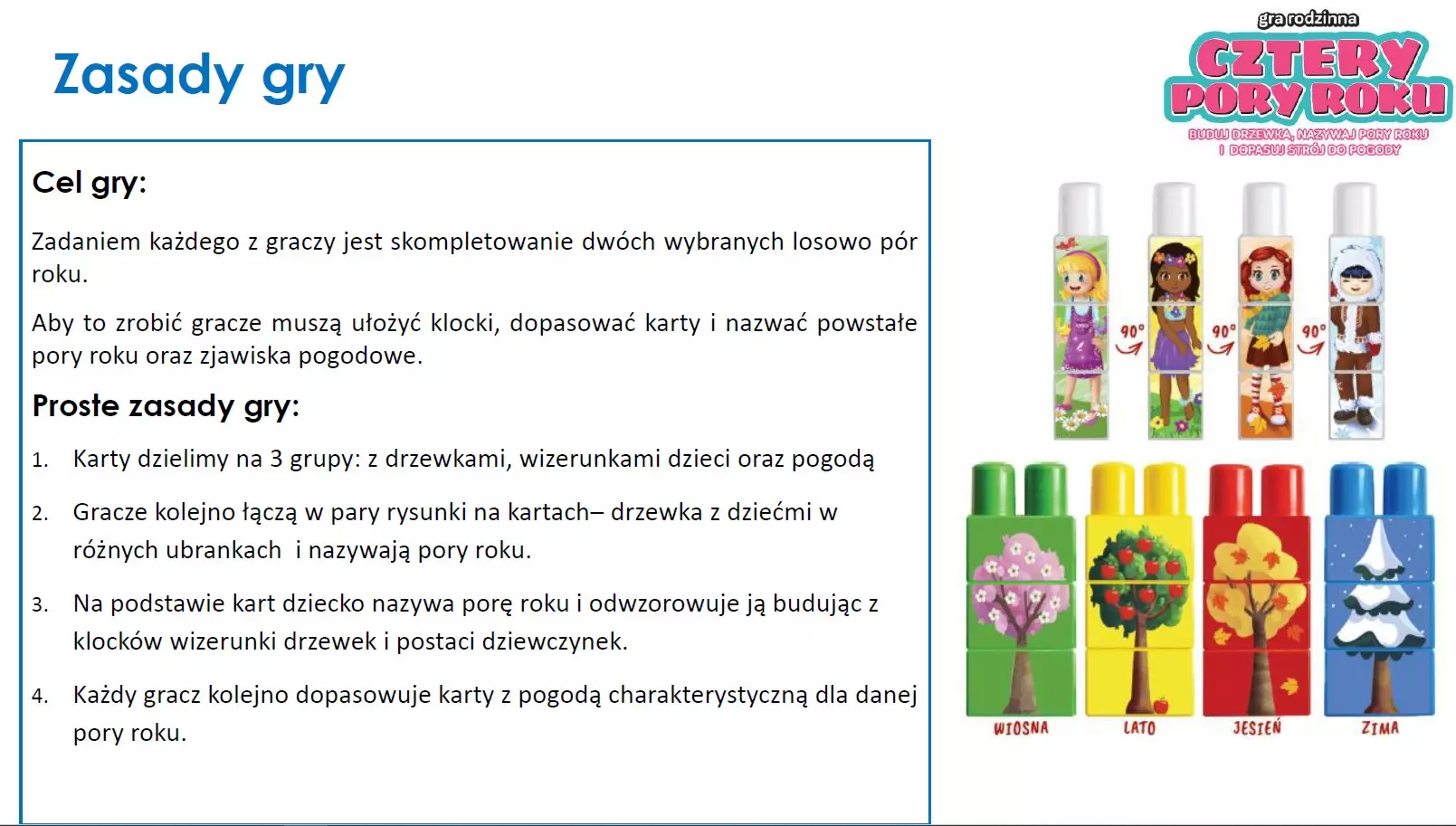 Wiosną drzewa pokrywają się listkami i kwiatami, lato przynosi zbiór owoców, jesienią wielobarwne liście opadają z drzew, a zima pokrywa je szronem i śniegiem - oto cykl życia przyrody. Dlaczego na Ziemi zmieniają się pory roku? Czy w każdym klimacie można wyróżnić 4 pory roku? Skąd bierze się śnieg? Dzieci są ciekawe świata wokół, chcą go poznawać i zadają wiele pytań. Najlepiej odpowiadać na nie w trakcie zabawy! Tematyka gry „Cztery pory roku” skupiona jest wokół przyrody i zjawisk w niej zachodzących. Podczas gry, dzieci uczą się rozpoznawania pór roku, cech charakterystycznych dla danego okresu, mają możliwość zadania wielu, podstawowych dla ich rozwoju poznawczego pytań. Gra daje również rodzicom pretekst do rozmowy o ekologii i ochronie naszej planety. To dobra i mądra zabawa, a do tego dająca wiele radości dzieciom i dorosłym! Gracze mają do dyspozycji klocki z wizerunkami drzew i dzieci oraz talię kart. Zadaniem gracza jest ułożenie wież z klocków w taki sposób, aby powstały drzewka charakterystyczne dla danej pory roku oraz dopasowanie do każdej z pór odpowiedniego stroju dziewczynki. Opis techniczny: • elementy gry, które są jednocześnie klockami, dzięki czemu po skończonej rozgrywce dzieci mogą bawić się dalej w dowolny sposób, używając tylko własnej wyobraźni; • prosty, a jednocześnie niepowtarzalny pomysł na grę, który ma wpływ na rozwój dzieci; • ciekawy scenariusz gry, który jest interesujący zarówno dla malucha jak i dorosłego; • jakość wykonania - wysokiej klasy tworzywo, brak ostrych krawędzi, wytrzymałość produktu, żywa kolorystyka; • gra zawiera naklejki do samodzielnego przyklejenia i kolorowe karty z zadaniami; • ciekawym pomysłem na wprowadzenie dziecko w zasady gry może być tłumaczenie ich zasad w trakcie rozkładania i oklejania jej elementów. Dzięki temu zazwyczaj najmniej ciekawy etap gry, stanie się angażujący i wciągający. Walory edukacyjne i rozwojowe gry: • rozwija koordynację wzrokowo-ruchową co jest szczególnie ważne dla prawidłowego rozwoju dziecka i uczenia się w szkole; • ćwiczy umiejętność odwzorowywania co stymuluje rozwój lewej półkuli mózgu (dostrzeganie różnic i ich analiza); • wpływa na rozwój koncentracji, ćwiczy myślenie logiczne i analityczne; • pozwala przeprowadzać ćwiczenia polegające na naśladowaniu wzorów prezentowanych na kartach lub układaniu wzorów z pamięci; • dzięki grze dziecko zdobywa podstawową wiedzę przyrodniczą; • gra uczy rozróżniania pór roku i cech charakterystycznych dla danego sezonu; • uczy rozróżniania kolorów; • wpływa na wzmocnienie relacji w rodzinie i w grupie rówieśników; • wzbudza pozytywne emocje, daje dużo radości i uśmiechu oraz motywacji do działania.