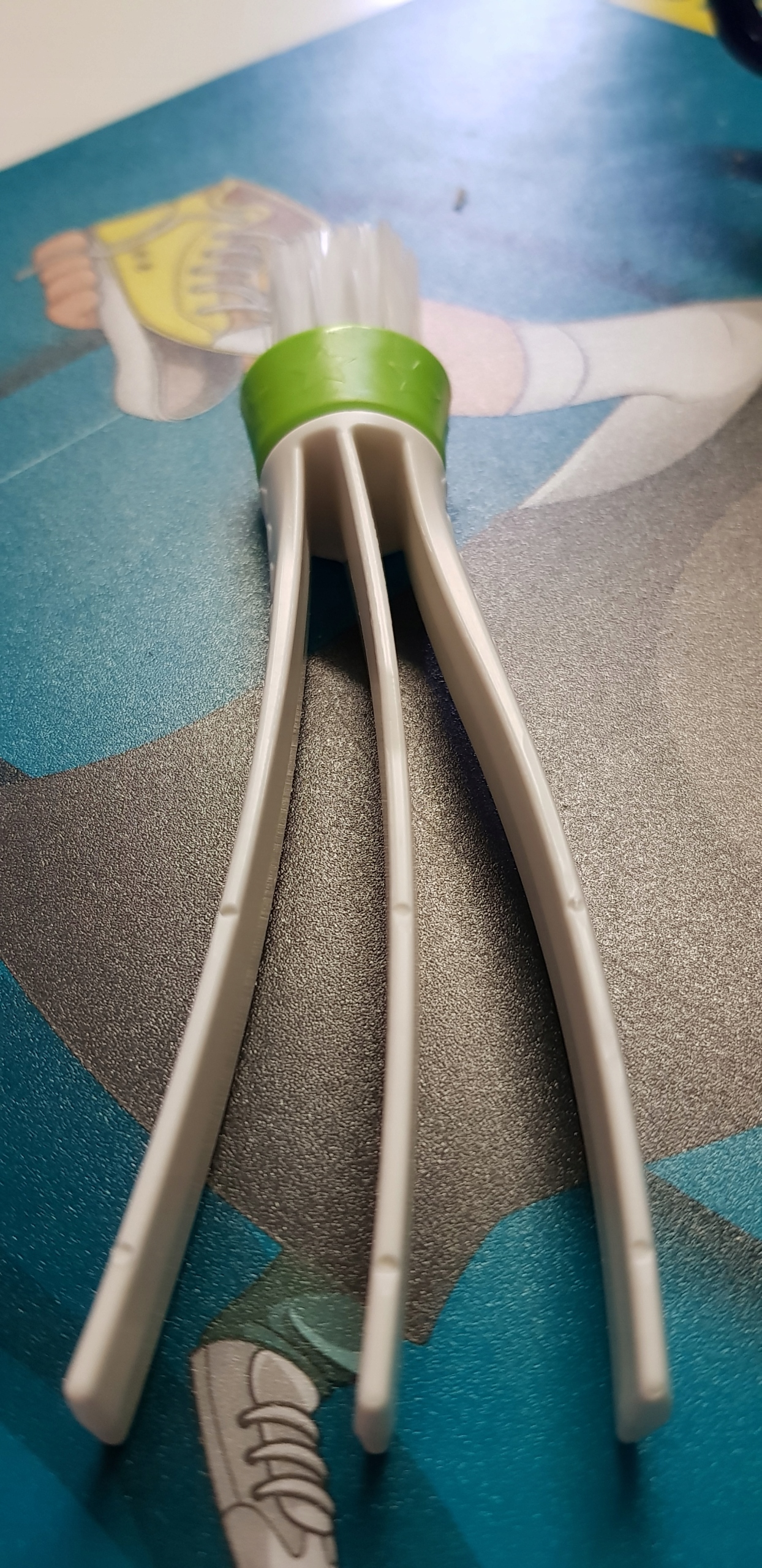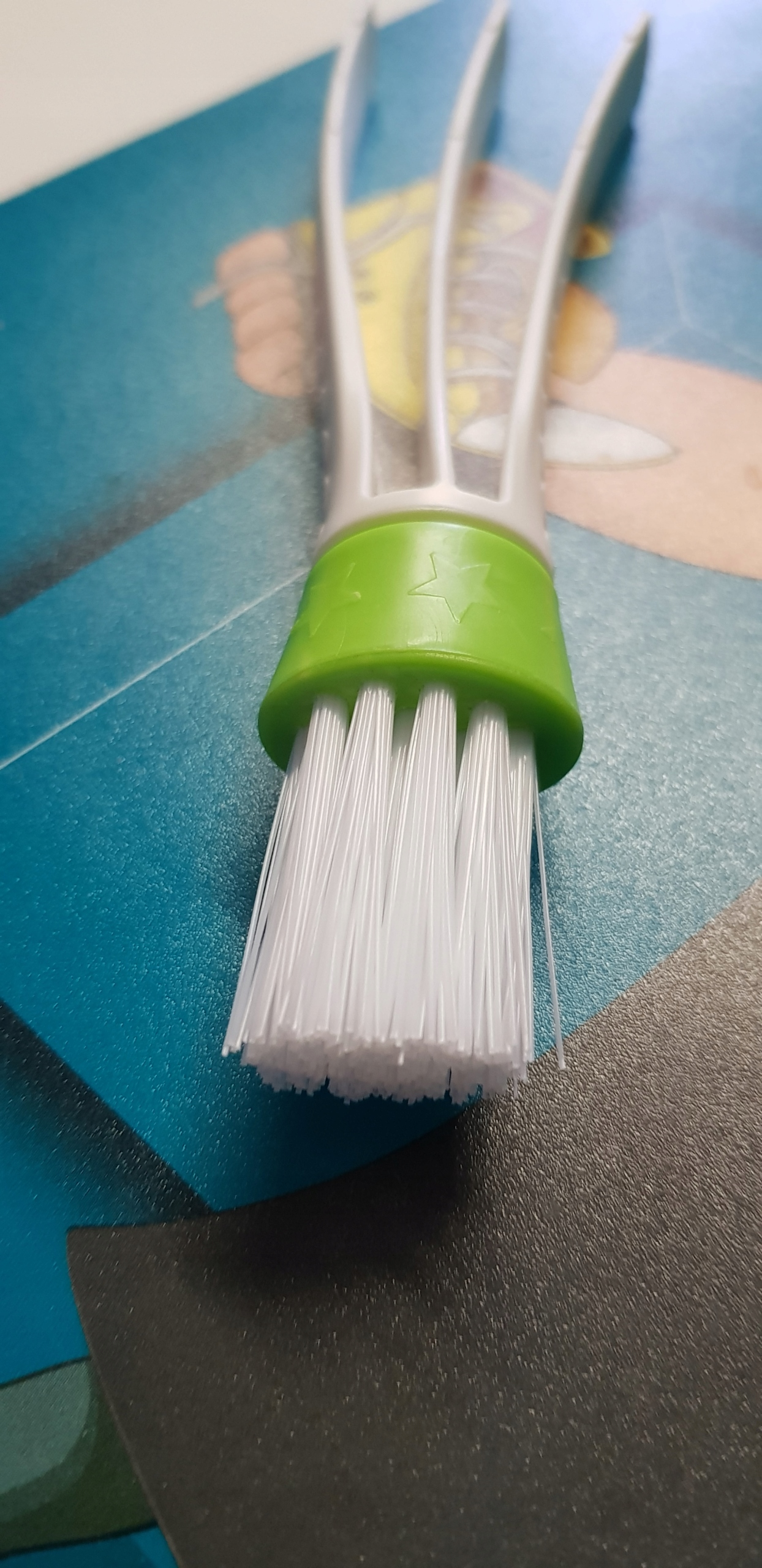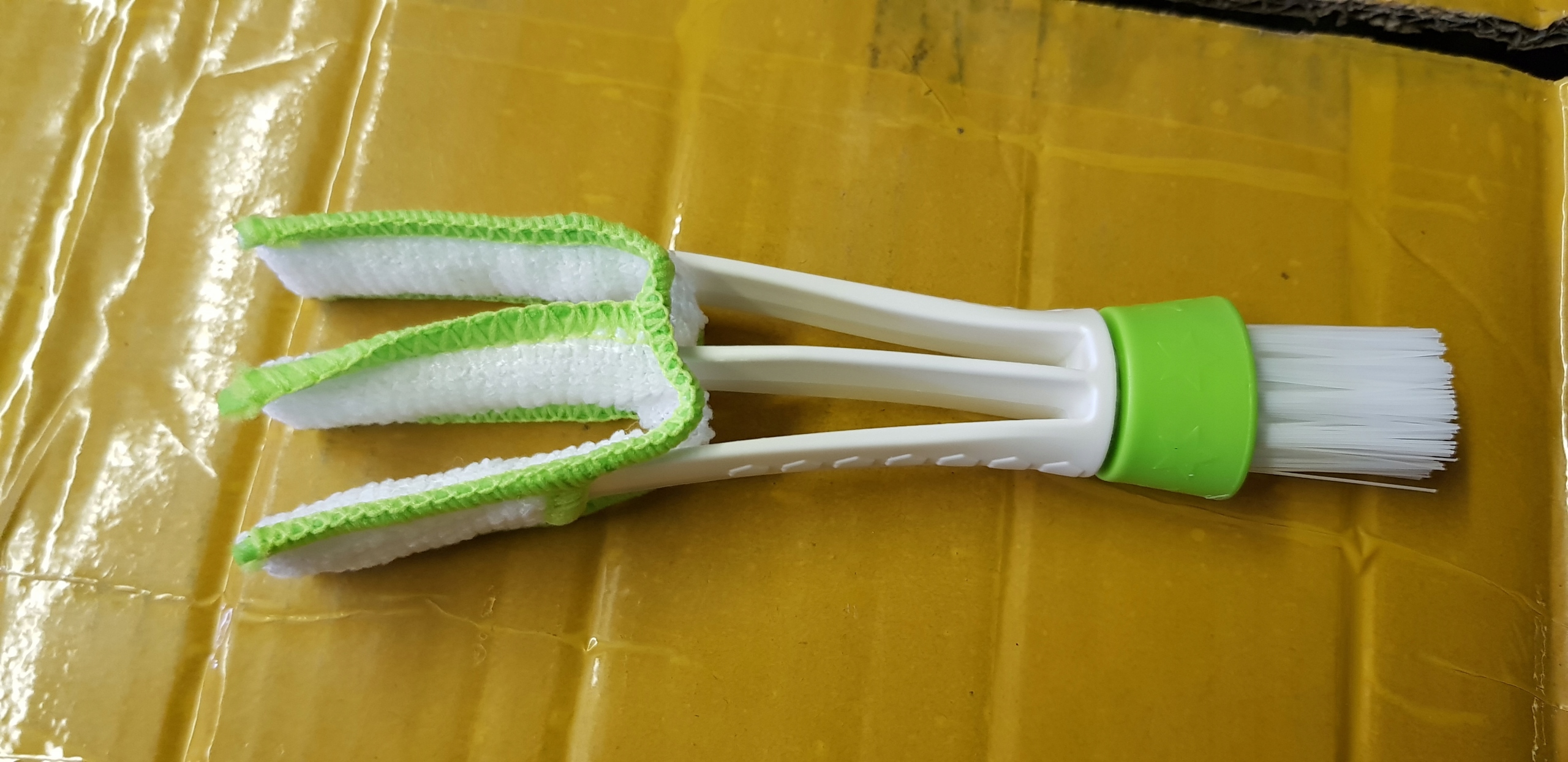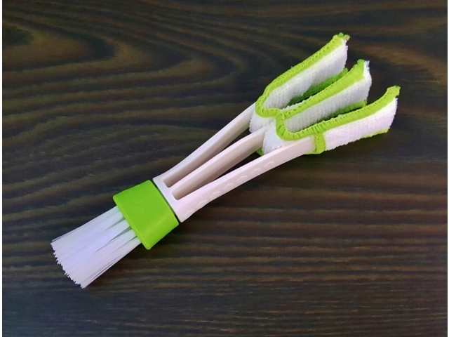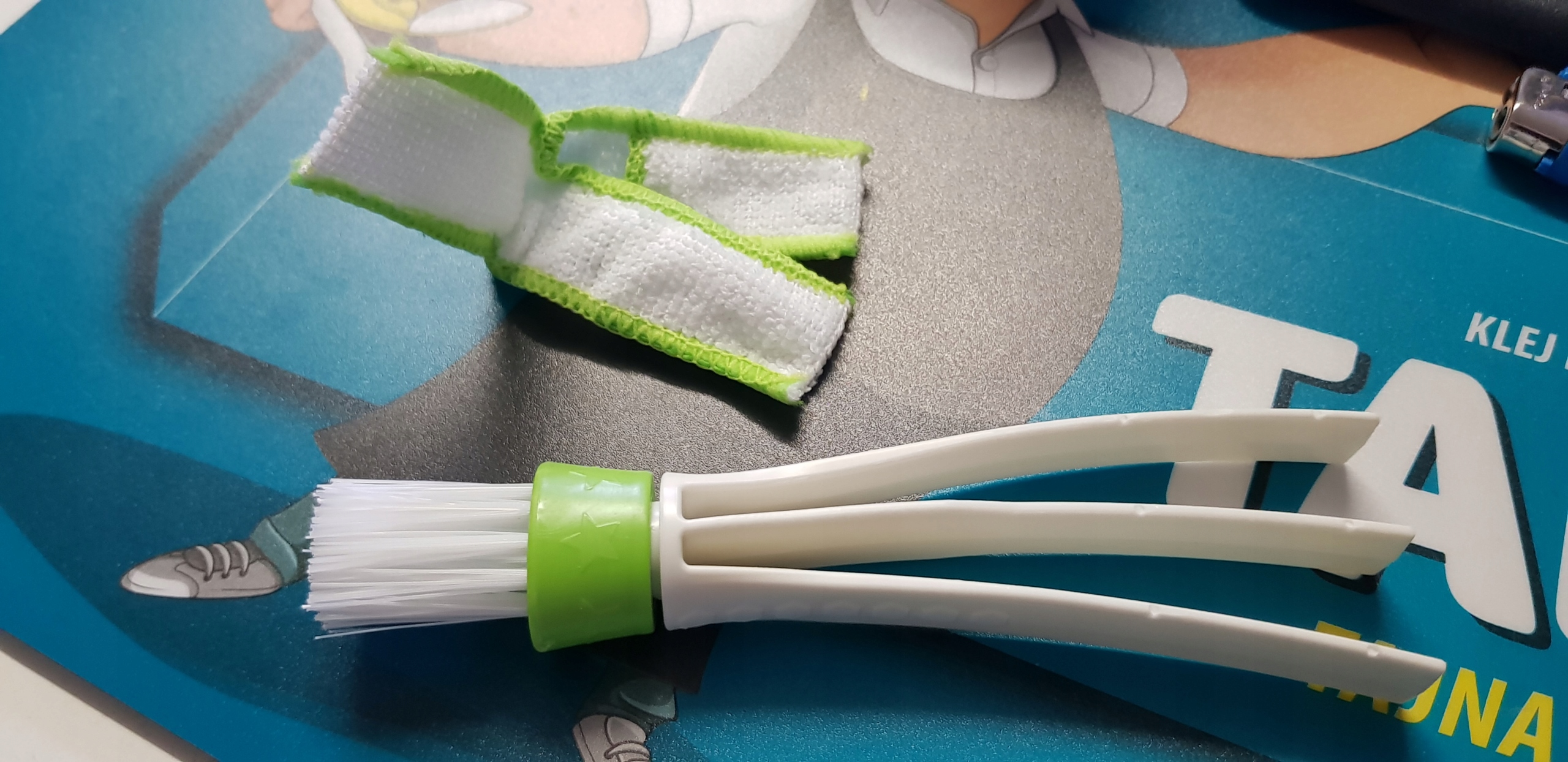 po jednej stronie znajdziemy twardy czyścik z włosiem, a po drugiej miękką ściereczkę zakładaną na potrójne ramię.