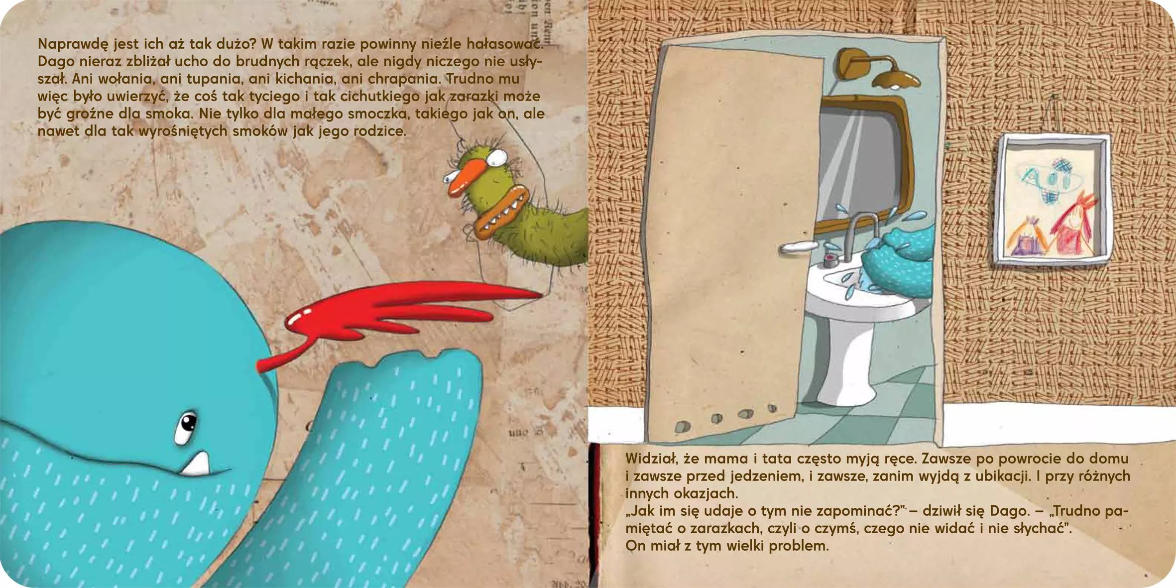 Tym razem Dago, z pomocą swojego przyjaciela Lo, poznaje zabawny sposób na polubienie mycia rąk. A dlaczego jest ono takie ważne i co to są zarazki, przekonuje się dość niespodziewanie – za sprawą malowanego przez siebie obrazka. Dago. Daleki krewny smoka wawelskiego i bazyliszka. Bohater, który wraz ze swoim przyjacielem Lo – żółtym balonikiem – zmienia się na oczach czytelnika. Wyjątkowe pióro Doroty Kassjanowicz i charakterystyczna kreska Roberta Romanowicza stworzyły dziewięć historyjek, składających się jak w puzzle w jedną kolorową całość, która wspiera rodziców w wychowywaniu. Dzięki zadaniom typu „porównaj obrazki” książeczki rozwijają spostrzegawczość maluchów, a słowniczek tłumaczący język Lo zachęca je do poprawnego mówienia. Wszystkie części spaja również bliźniaczy początek i koniec, a także obraz tej samej ulicy, na której zachodzą zmiany wymagające uważności czytelnika. Dla dzieci w wieku 1–5 lat. Dago, Lo i zabawa w puzzle. Tył okładki wszystkich 9 części ułoży się w jeden duży obrazek!
