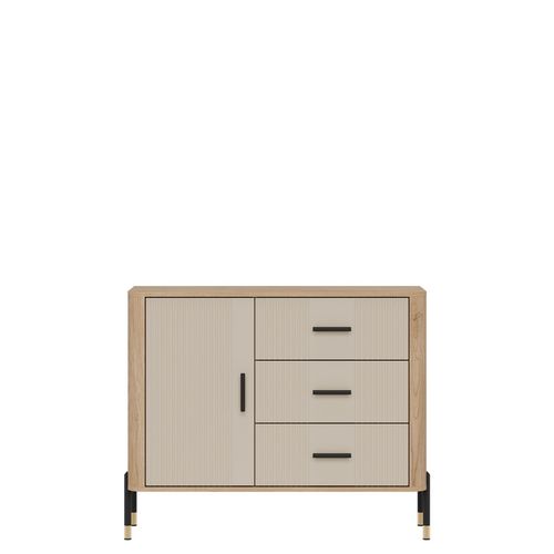 Komoda zachwyca starannie dobranym zestawieniem materiałów i kolorów. Matowe, fronty w 5 wersjach kolorystycznych do wyboru współgrają z ciepłym odcieniem naturalnego drewna, tworząc spójną i nowoczesną kompozycję. Złote i czarne detale – w postaci smukłych uchwytów i subtelnych wykończeń nóg – dodają całości luksusowego sznytu, podkreślając elegancję formy bez przesadnej ekstrawagancji.