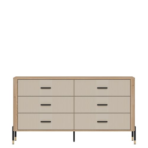 Sześć szerokich, symetrycznie rozmieszczonych szuflad oferuje znakomitą przestrzeń do przechowywania odzieży, dokumentów, dodatków czy tekstyliów. To idealny wybór zarówno do sypialni, salonu, jak i do przestrzeni biurowej. Matowe fronty szuflad do wyboru z pięciu wariantów kolorystycznych, kontrastują z ciepłym korpusem w kolorze naturalnego drewna, tworząc efektowną i jednocześnie stonowaną kompozycję.