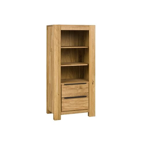 Regał dębowy Parma posiada funkcjonalne trzy półki i dwie szuflady zamocowane na prowadnicach z cichym domykiem.