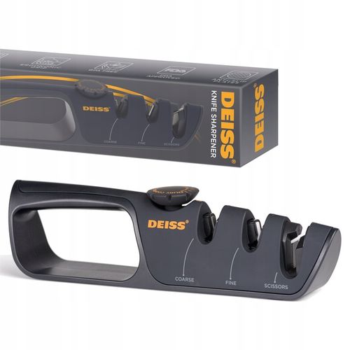 Ten profesjonalny system ostrzenia noży Deiss zapewnia łatwe i skuteczne ostrzenie szerokiej gamy noży kuchennych oraz innych narzędzi. Jego 3-stopniowa konstrukcja ze stopu wolframu, ceramiki i diamentu gwarantuje doskonałe przywrócenie fabrycznej ostrości.