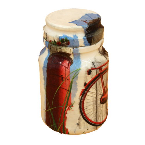 Szklany słoik dekoracyjny wykonany metodą decoupage to idealny dodatek ozdobny do każdego domu. Swoim zastosowaniem sprawdzi się nie tylko w części kuchennej, ale również salonowej. Ciekawy motyw przedstawia elegancki, czerwony rower na drewnianym tle oraz wieżę również w podobnej tonacji kolorystycznej. Całość słoika pokryta jest białą farbą. Pęknięcia oraz przetarcia są elementami dekoracyjnymi, postarzające przedmiot. Produkt pokryty jest lakierem, co zapewnia trwałość. Ręczne wykonanie gwarantuje niepowtarzalność i wyjątkowość nie tylko we wzornictwie, lecz także w swojej prostocie.