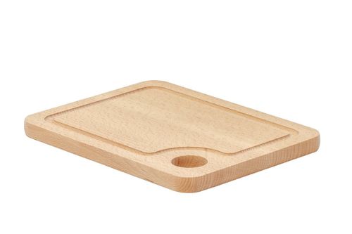 Drewniana deska do krojenia – przydatna w każdej kuchni. Na jednej stronie deski wyfrezowany kanał odprowadzający nadmiar soku z potraw oraz otwór umożliwiający zawieszenie.