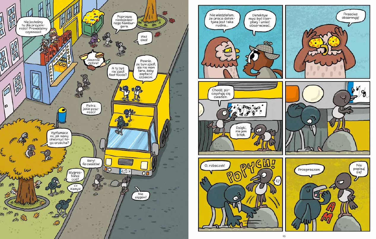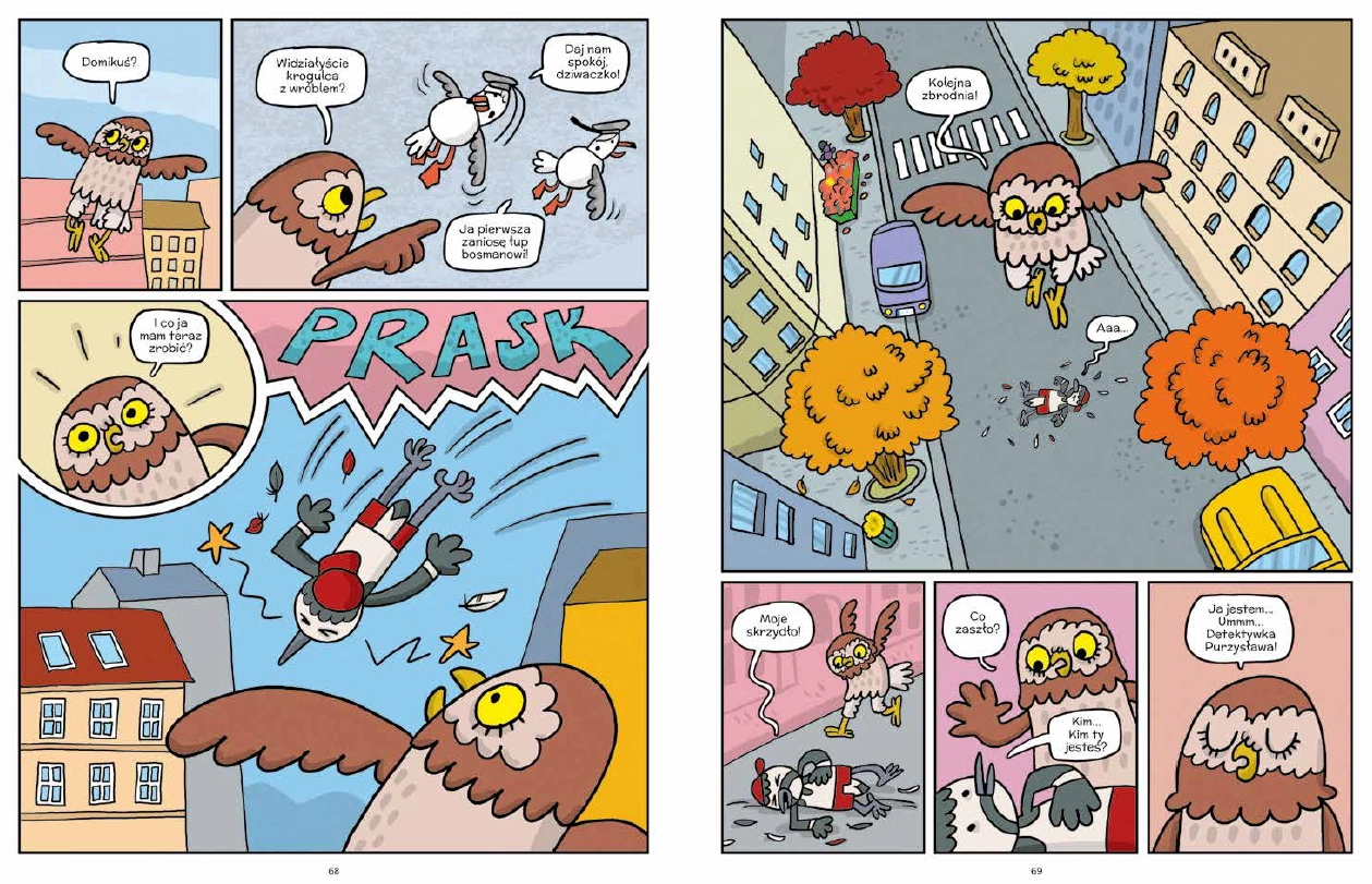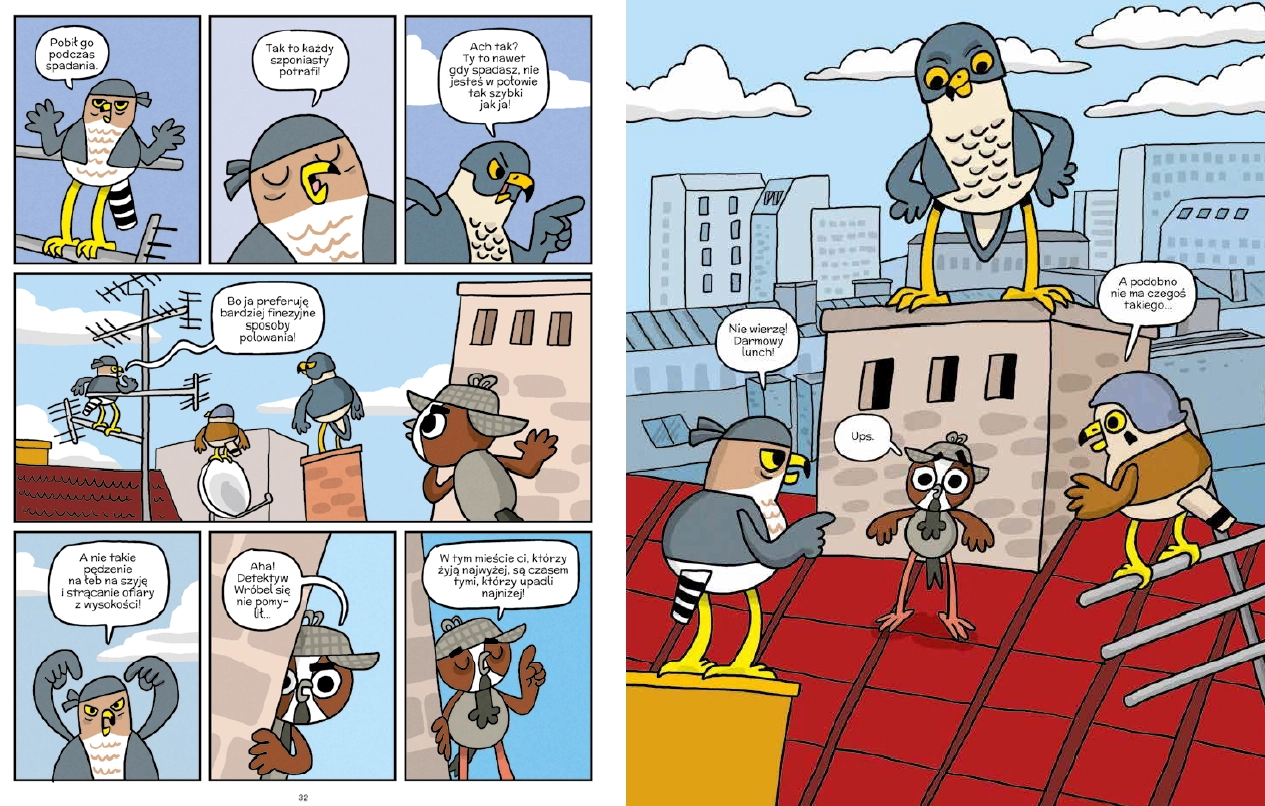 Tomasz Samojlik i Adam Wajrak przedstawiają: Kryminalne zagadki wielkiego miasta (w wersji ornitologicznej, rzecz jasna) Nowy komiks najfajniejszego duetu przyrodników z Puszczy Białowieskiej. Dzieje się coś podejrzanego, obywatele ptaki! Wróble na mieście ćwierkają, że zrobiło się niebezpiecznie. Ni stąd, ni zowąd z nieba zaczęły spadać ptaki. Kto je atakuje: sokół, wrony, krogulec? Jak w miejskiej dżungli namierzyć winnego? Toż to grubsza sprawa. Sprawa dla prawdziwego detektywa, Detektywa Wróbla. Może i nie ma dużego doświadczenia, ale nie brakuje mu zapału. No i towarzyszy mu ciekawska włochatka Purzysława. Znakomita zabawa, prześmieszne dialogi, solidna porcja wiedzy przyrodniczej oraz misja, która może zmienić miasto na lepsze! Trzymajcie kciuki za rozwiązanie zagadki! Detektyw Wróbel to kolejny po trylogii Umarły Las, Nie umarły Las i Zew Padliny komiks Tomasza Samojlika z przyrodniczymi opowieściami i zdjęciami autorstwa Adama Wajraka.