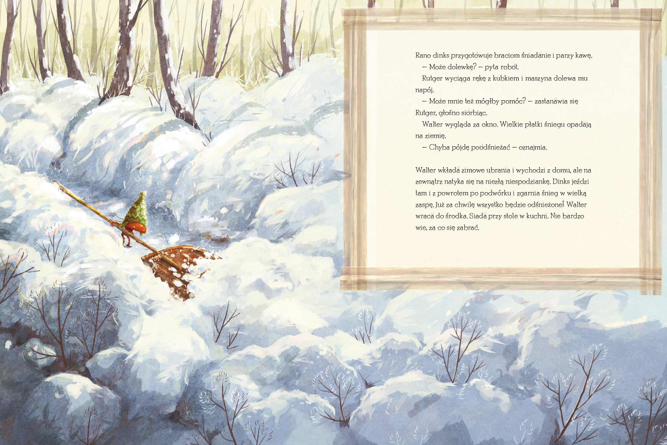 Martin Widmark i Emilia Dziubak mierzą się z tematem AI – sztucznej inteligencji. Stworzyli humorystyczną opowieść, która kryje w sobie refleksję nad tym, co może się wydarzyć, kiedy władzę nad swoim życiem oddamy technologii. Bracia Rutger i Walter mieszkają razem i żyją spokojnym życiem. Nieco znużony obowiązkami domowymi Rutger konstruuje największy wynalazek wszech czasów: robota, który gotuje, sprząta, zmywa i zajmuje się wszystkimi nudnymi i czasochłonnymi zajęciami! Kiedy już wszystko w domu jest zrobione, robot przenosi swoje zainteresowanie na braci. Muszą mniej jeść! Więcej spacerować! Przestać wierzyć w Świętego Mikołaja. O wiele za późno bracia zdają sobie sprawę, że próbując ułatwić sobie codzienność, w rzeczywistości pozbawili się wszelkiej radości z życia…