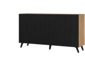 Fronty nie mają uchwytów, można je otworzyć lekko dociskając krawędź. Uchylą się wtedy do pozycji umożliwiającej łatwe otwieranie. Meble może być ustawiony na czarnych nóżkach z wytrzymałego tworzywa. Komoda występuje również w wersji na cokole. może być również na cokole.