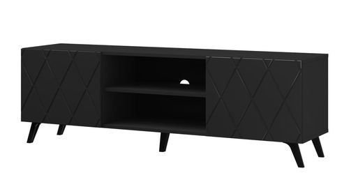 Fronty nie mają uchwytów, można je otworzyć lekko dociskając krawędź. Uchylą się wtedy do pozycji umożliwiającej łatwe otwieranie. Meble może być ustawiony na czarnych nóżkach z wytrzymałego tworzywa. Szafka RTV może być w wersji na cokole lub w wersji podwieszanej.