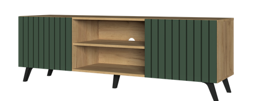 Fronty nie mają uchwytów, można je otworzyć lekko dociskając krawędź. Uchylą się wtedy do pozycji umożliwiającej łatwe otwieranie. Meble może być ustawiony na czarnych nóżkach z wytrzymałego tworzywa. Szafka RTV może być w wersji na cokole lub w wersji podwieszanej.