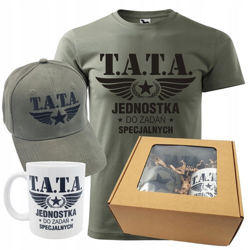 Koszulka, kubek i czapka ozdobione są wyjątkowym nadrukiem "T.A.T.A. JEDNOSTKA DO ZADAŃ SPECJALNYCH", który podkreśla niezwykłą rolę taty jako męża, opiekuna i bohatera codzienności. Ten spersonalizowany akcent sprawi, że zestaw będzie jedyny w swoim rodzaju.