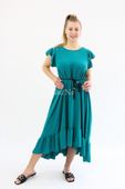 Sukienka ma wycięcie na plecach, które pięknie eksponuje plecy i sprawia, że sylwetka wygląda smuklej. Dodatkowo, falbana na dole sukienki dodaje jej lekkości i zwiewności dzięki czemu sukienka fenomenalnie prezentuje się w ruchu Sukienka posiada efektowny fason high low, który delikatnie eksponuje nogi. Nie zapominamy także o falbanach na ramionach, które dodają uroku i nadają sukience jeszcze bardziej kobiecy wygląd.