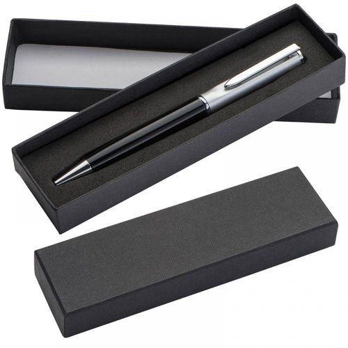 Długopis metalowy ze srebrnym wykończeniem i niebieskim wkładem o dużej pojemności.