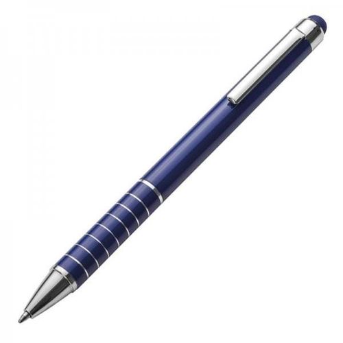 Długopis metalowy z mechanizmem obrotowym i gumką do obsługi ekranów dotykowych.