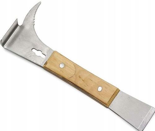 Dłuto jest kompleksowo wyposażone w drewnianą oprawę oraz specjalnie wyprofilowany hak, który jest szczególnie przydatny podczas wyciągania ramek. To sprawia, że staje się niezastąpionym elementem wyposażenia każdego pasieczego.