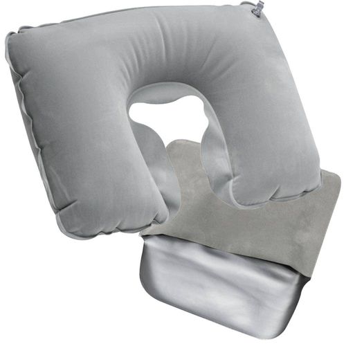 Welurowa, dmuchana poduszka podróżna o ergonomicznym kształcie.