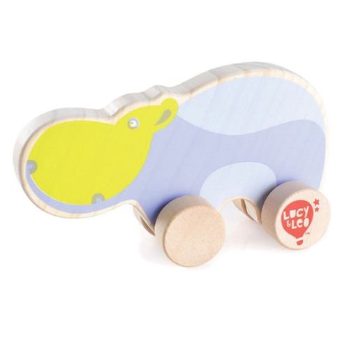 Hipopotam na kółkach wykonany z drewna w pięknych kolorach, przyciągających uwagę dziecka.