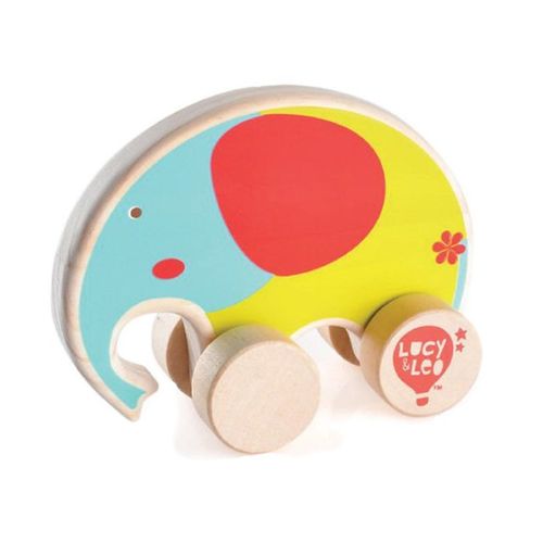 Słoń na kółkach wykonany z drewna w pięknych kolorach, przyciągających uwagę dziecka.