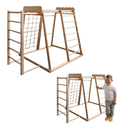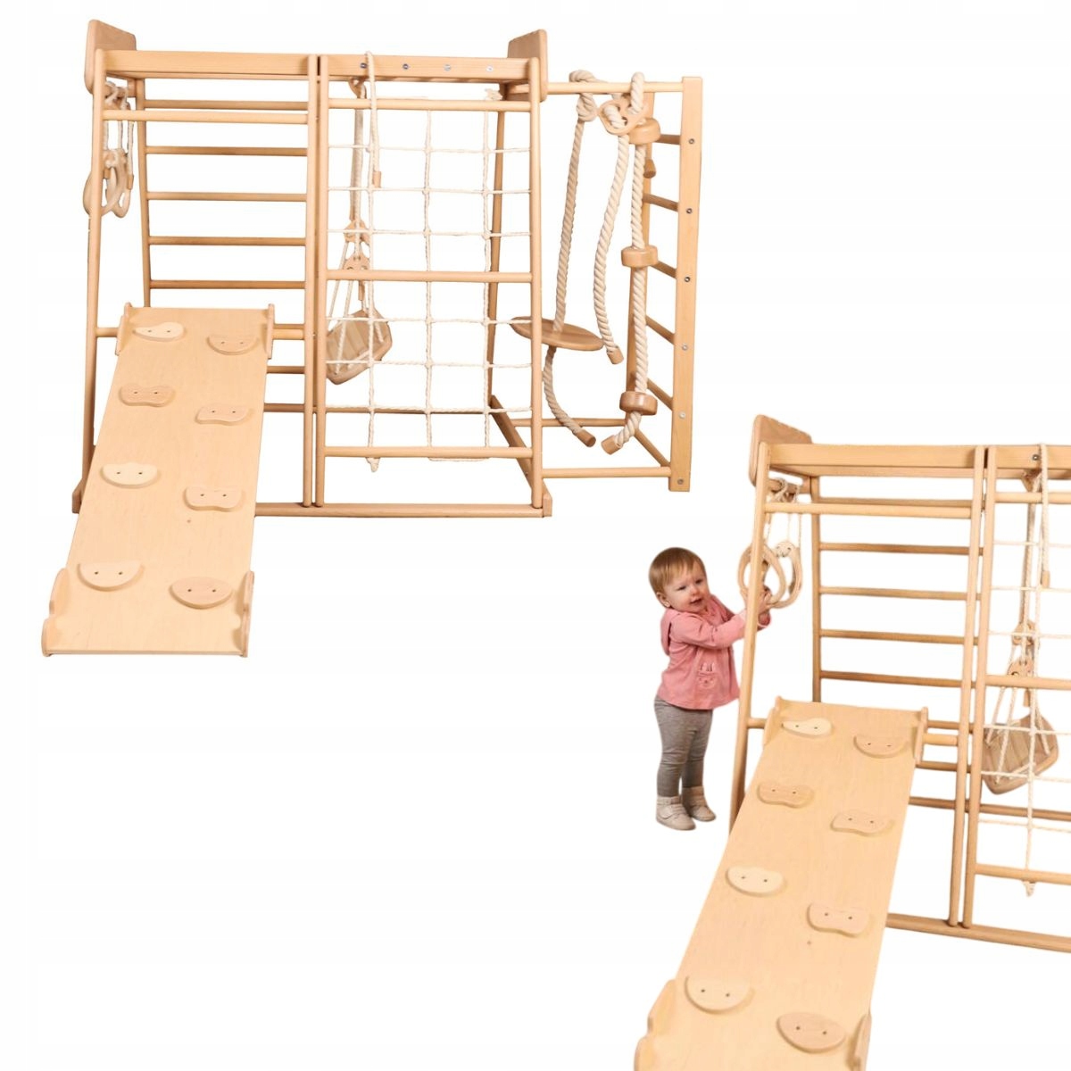 Zestaw dla dzieci został zaprojektowany z myślą o rozrywce i wszechstronnym rozwoju poprzez zabawę. Domowy kącik sportowy ma kompaktowe wymiary oraz bezpieczną i stabilną konstrukcję wykonaną z litego drewna bukowego. Dzięki temu kompleks zabawowy dla dzieci wytrzymuje obciążenie ponad 60 kg. Produkt przeznaczony jest do długotrwałego i aktywnego stosowania.