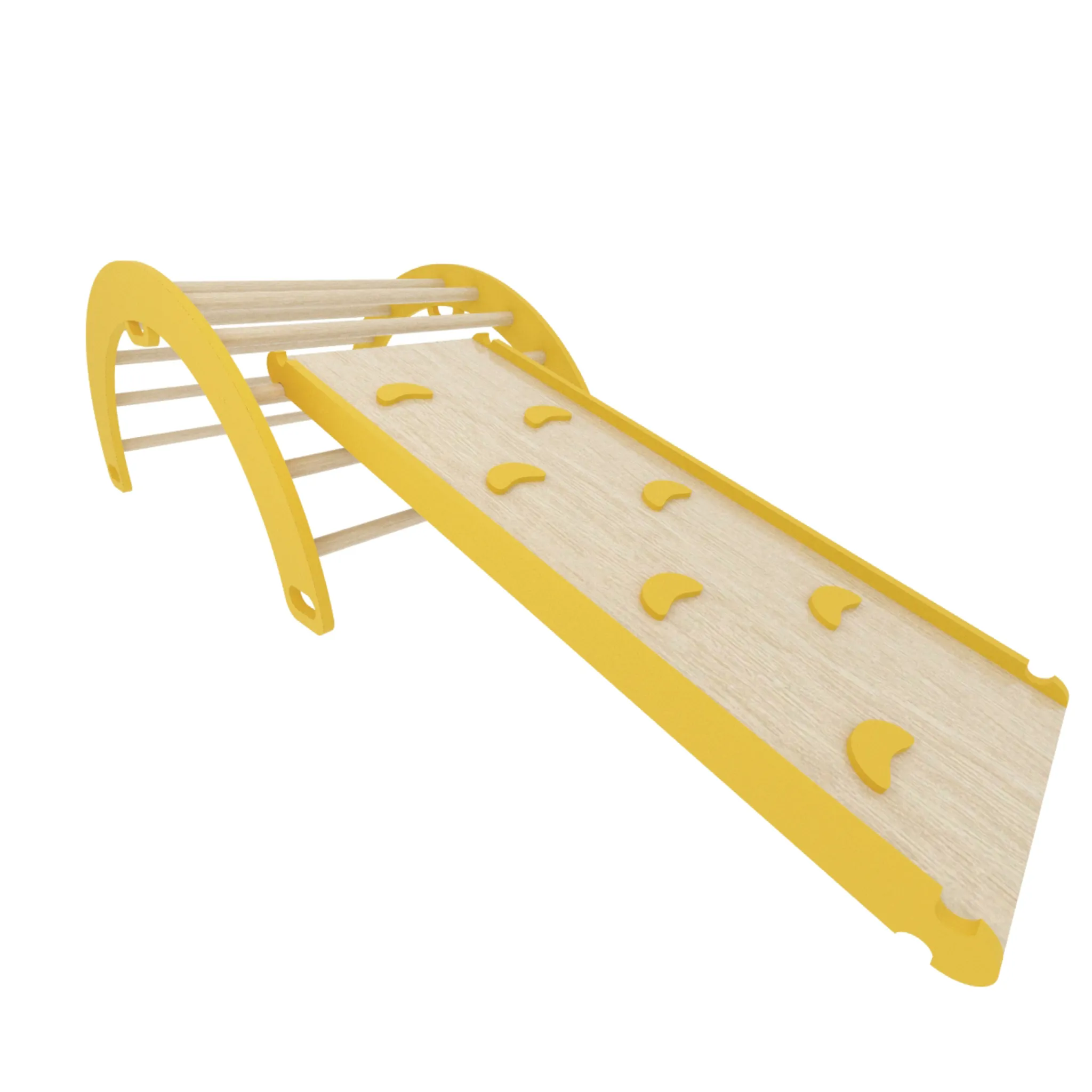 Ten drewniany plac zabaw do domu to zestaw składający się z bujaka-drabinki oraz zjeżdżalni, którą z łatwością przemienisz w ściankę wspinaczkową – jedyne co musisz zrobić, to odwrócić element na drugą stronę! Zapewnij dziecku masę zabawy i rozwoju, dzięki domowemu placu zabaw, który powstał zgodnie z zamysłem metody Montessori.