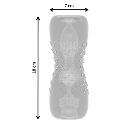 Dwustronna pochwa stymulująca penisa. Doskonale ukształtowane wnętrze, zawiera prążki i wypustki mające na celu dostarczenie najbardziej realistycznych doznań. Duży rozmiar (18 x 7 cm) pozwala na korzystanie z pochwy wszystkim mężczyznom, bez względu na rozmiar członka.