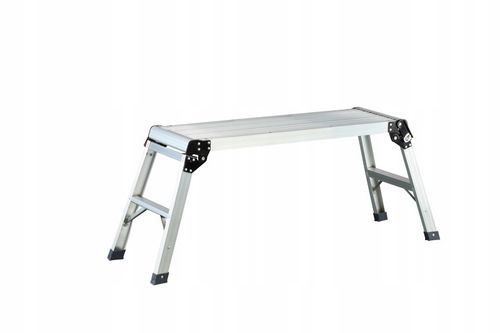 Podest wykonany jest z wytrzymałego aluminium, wyposażony w antypoślizgowe nakładki na nóżkach oraz ryflowane szczeble, co gwarantuje wysokie bezpieczeństwo podczas pracy na wysokości. Maksymalne obciążenie to aż 150 kg.