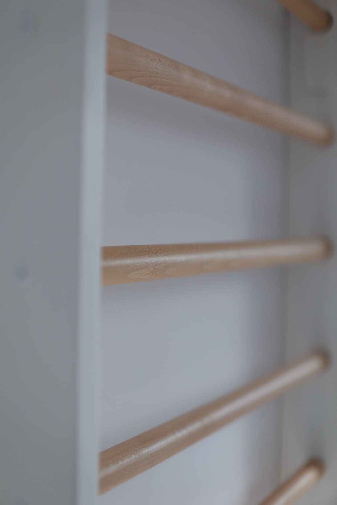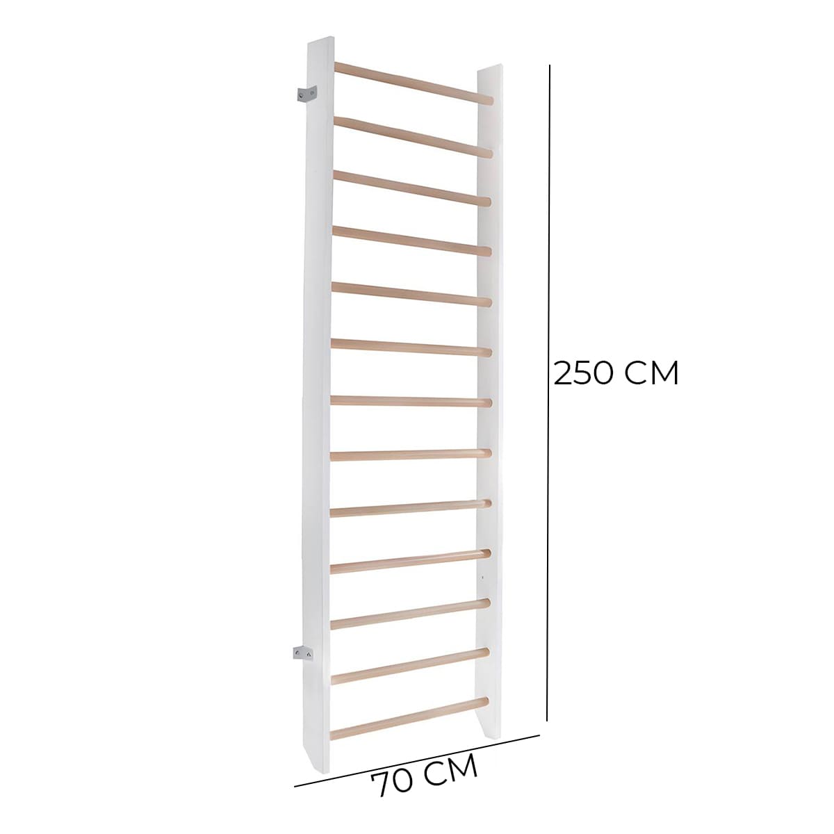 Drabinka gimnastyczna drewniana jest klasycznym zestawem gimnastycznym do ćwiczeń dla dzieci i dorosłych wykonanym z drewna sosnowego i bukowego. Drabinka rehabilitacyjna jest pokryta lakierem o podwyższonej ścieralności. Szczeble drabinki są okrągłe. Drewniane drabinki gimnastyczne cechują się bezpieczną konstrukcją opartą o wytrzymałe słupki, wykonane z drewna sosnowego. Naturalny kolor nadaje drabince estetyczny, stylowy wygląd i pozwala wtopić się w wystrój nowoczesnych pokoi dziecięcych.