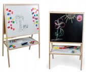 Duża drewniana tablica suchościerna jest świetną zabawką dla Twoich Pociech. Jest idealnym miejscem na ćwiczenie pierwszych literek, cyferek oraz wspaniałych rysunków. Wykonana bardzo solidnie, z wysokiej jakości tworzyw. Z jednej strony tablica suchościerna do pisania markerami, z drugiej tradycyjna tablica kredowa. |
