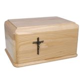 Drewniana urna wykonana z jasnego drewna / Plakietka
